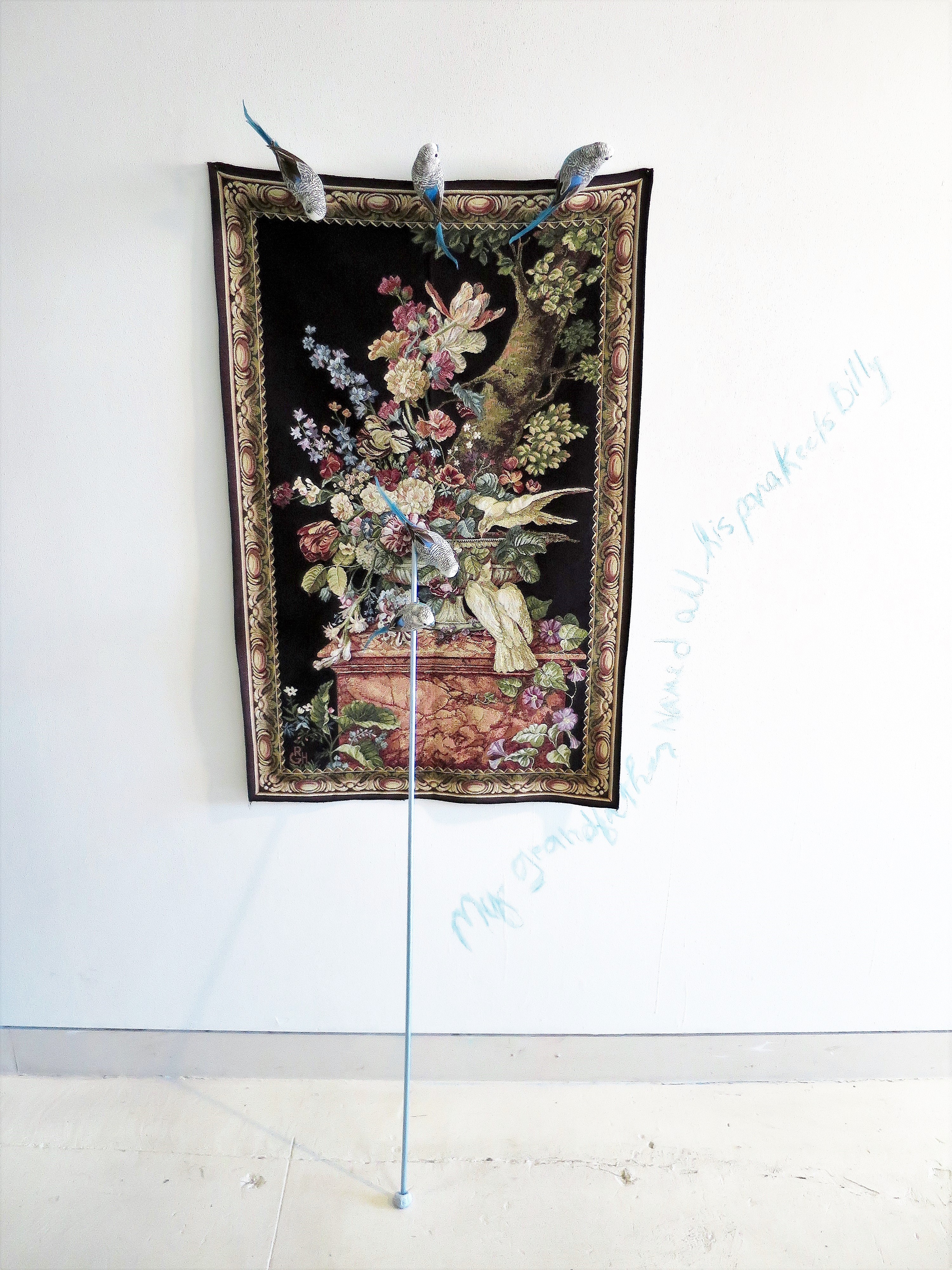 ‘Twitchers’, at Articulate project space from 16 to 31 July, 2016 included artists Linden Braye, Juliet Fowler Smith, Anne Graham, Noelene Lucas and Debra Porch. Image: Debra Porch, My Grandfather named all his parakeets Billy, mixed media, 2016.